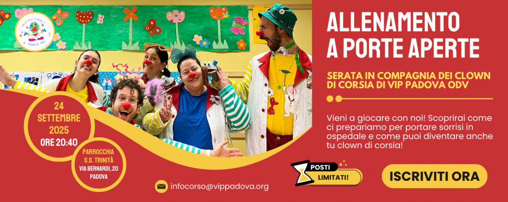 Fino al 31 ottobre 2025, accoglieremo le candidature degli aspiranti volontari clown di corsia e le iscrizioni al corso. Puoi iscriverti compilando il form che trovi al seguente link. Se hai altre curiosità o domande da farci, scrivi a infocorso@vippadova.org.